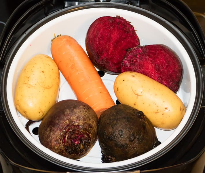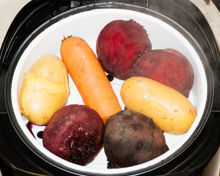 Установили программу «На пару́», увеличили продолжительность работы до 40 минут. Отсчет времени приготовления начался после того, как вода в чаше закипела. На это потребовалось около 10 минут. За 10 минут до окончания цикла открыли мультиварку и вытащили картофель, морковь и половинки свеклы, которые оказались достаточно мягкими. Две небольшие целые свеколки еще были жестковаты, поэтому с помощью мобильного приложения и функции Мастершеф Лайт добавили еще 30 минут работы. После часа тепловой обработки свекла достигла той степени мягкости, которая позволила назвать овощ сваренным.