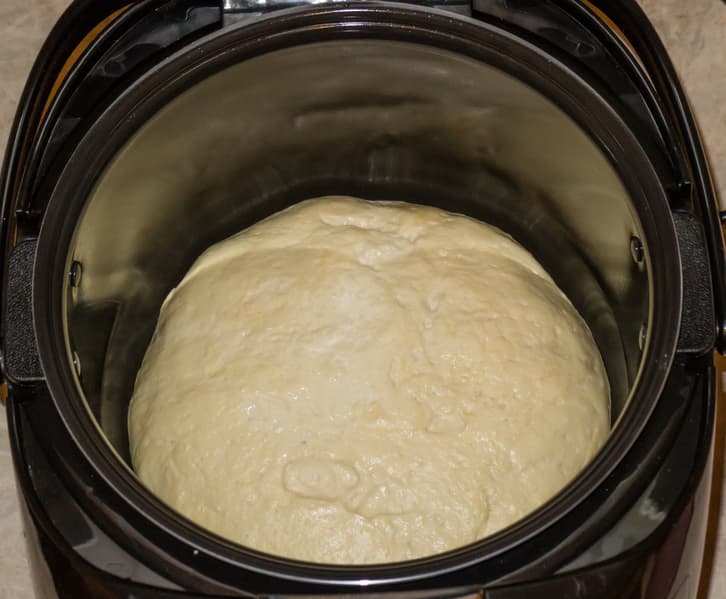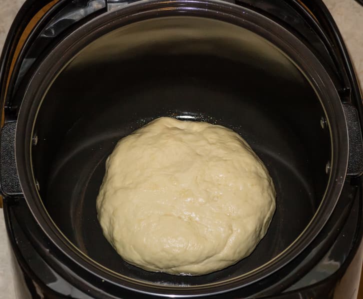 После того, как раздались звуковые сигналы, извещающие о завершении работы, в чаше оказалось увеличившееся в 2-2,5 раза тесто. Комок теста равномерно прогрет, нижняя часть, соприкасающаяся с дном, мягкая, не подпеченная и не подсохшая.