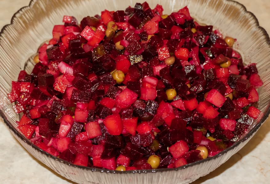 После того, как овощи остыли, нарезали их на кубики, добавили заранее замаринованный мелко нарезанный салатный фиолетовый лук, соленые огурцы, горошек и соус из нерафинированного подсолнечного масла, яблочного уксуса и растертых зерен горчицы.