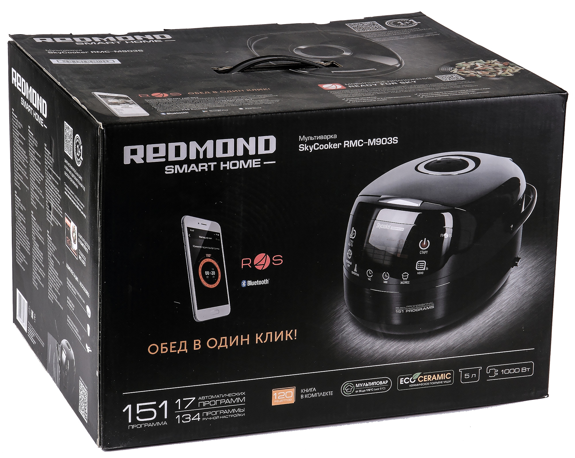 Сегодня мы рассмотрим мультиварку Redmond SkyCooker RMC-M903S. Прибор оснащен технологией дистанционного управления Ready for Sky. При запуске мобильного приложения с соответствующим названием пользователь получает доступ ко всем функциям мультиварки: от выбора программы приготовления до установки времени отложенного старта. Приложение дает возможность также воспользоваться книгой рецептов.