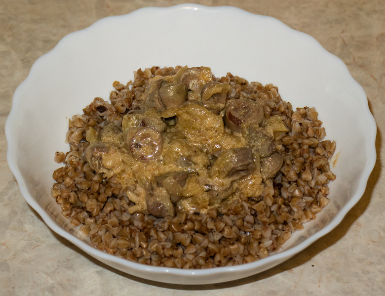 Тушеные в сметане куриные сердечки с гречневой кашей