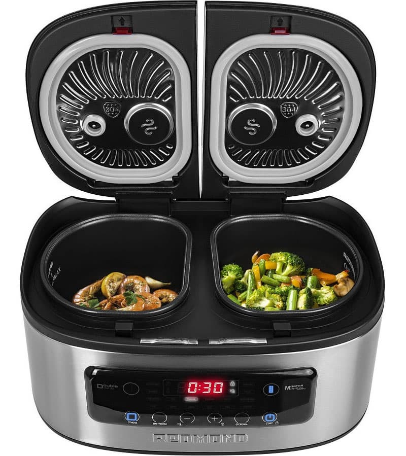На тестировании у нас Redmond RMC-MD200 — это мультиварка с 2 чашами и возможностью одновременного приготовления 4 разных блюд. Чаши имеют независимые тэны, и, как утверждает производитель, никак не влияют на работу друг друга. Получить за сравнительно небольшие деньги прибор, позволяющий за одну загрузку приготовить полноценный обед из 4 блюд, наверное, мечта многих. Будем разбираться, насколько эта мечта может стать реальностью.