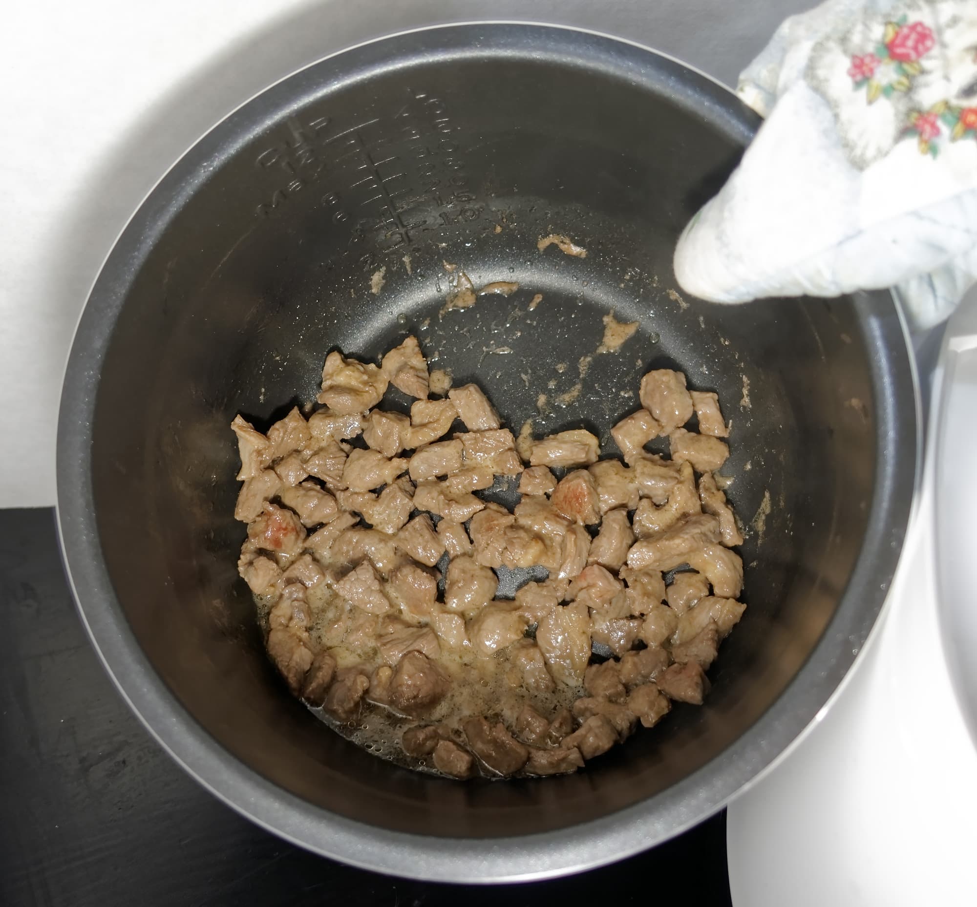 Первым делом мы обжарили мясо на режиме «Жарка/Фритюр». Получилось довольно предсказуемо — с какого-то момента мясо начало не жариться, а тушиться. Все-таки мультиварки, несмотря на наличие одноименного режима, для обжарки ингредиентов не предназначены. Лук и морковь мы обжаривали уже на газу, на чугунной сковородке — так надежнее.