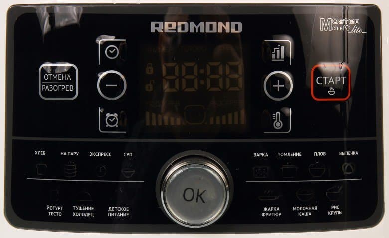 - Режимов — «Хлеб», «На пару́», «Экспресс», «Суп», «Варка», «Томление», «Плов», «Выпечка», «Йогурт/Тесто», «Тушение/Холодец», «Детское питание», «Жарка/Фритюр», «Молочные каши», «Рис/Крупы».
