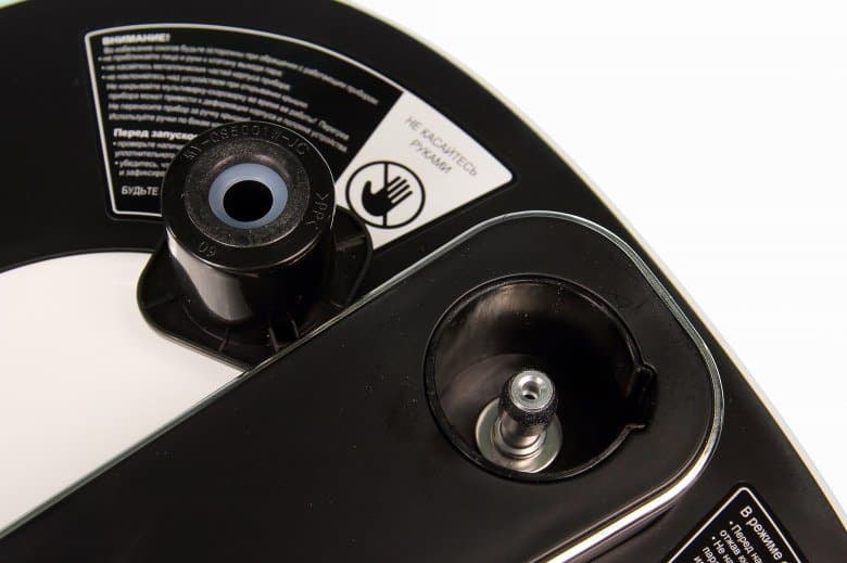 Крышка устройства съемная; на ручке крышки расположен съемный паровой клапан и кнопка, открывающая и закрывающая его. Сбоку от ручки расположен красный запорный клапан. Крышка закрывается поворотом по часовой стрелке до щелчка, место паза отмечено на корпусе специальной иконкой.
