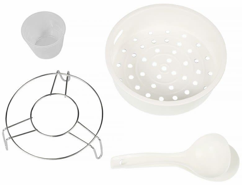Внутри коробки находятся два пенопластовых вкладыша, жестко удерживающих мультиварку сверху и снизу. Кроме самого прибора в комплекте обнаруживается классический набор: черпак и плоская ложка, мерный стакан, пластиковый контейнер для приготовления на пару́ и металлическая подставка под него.