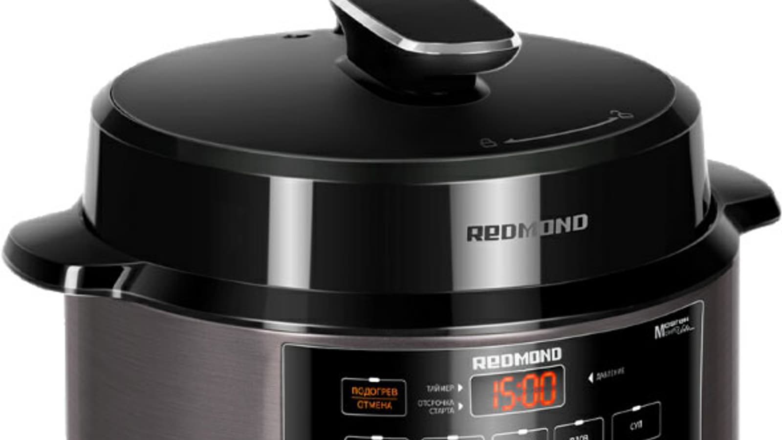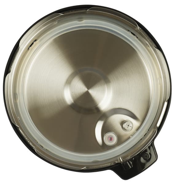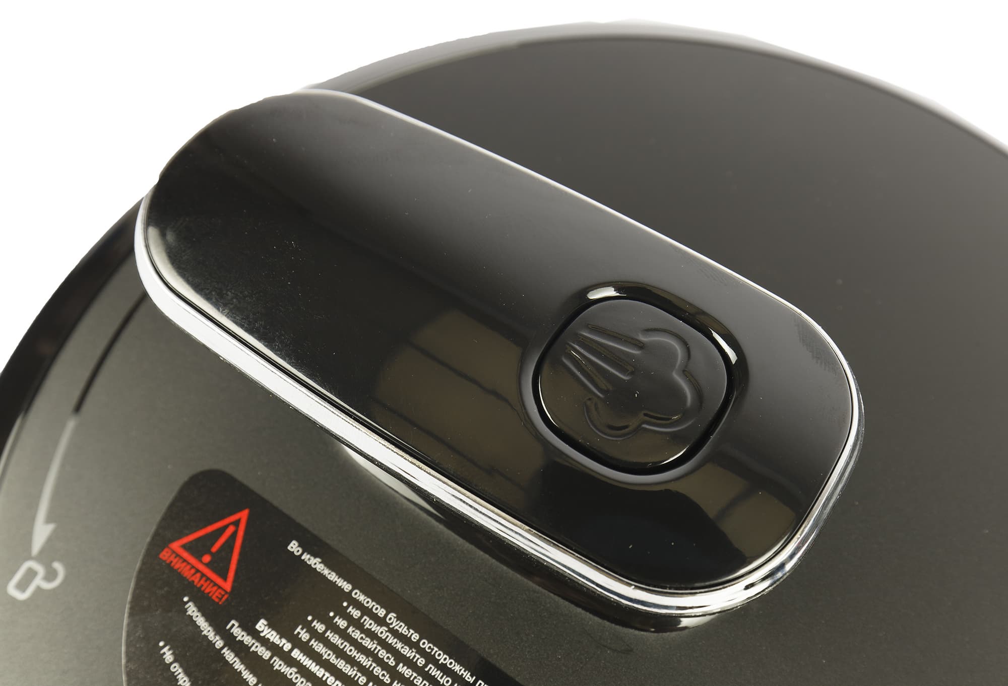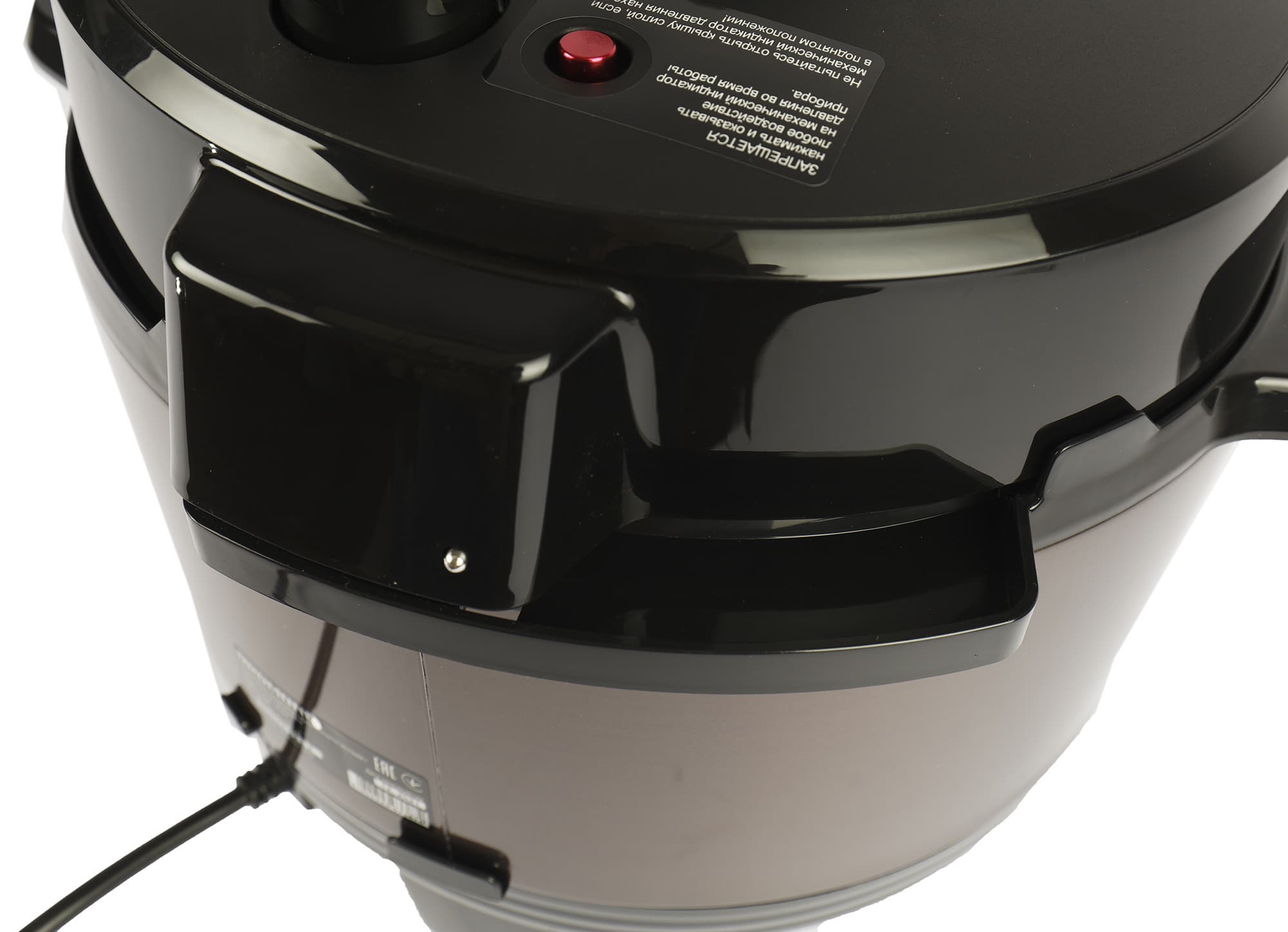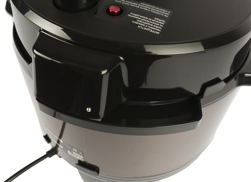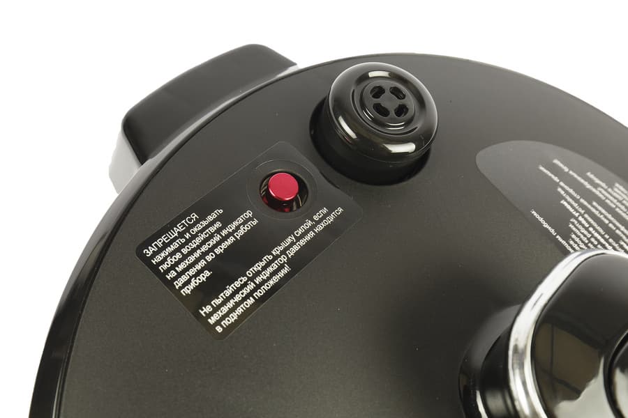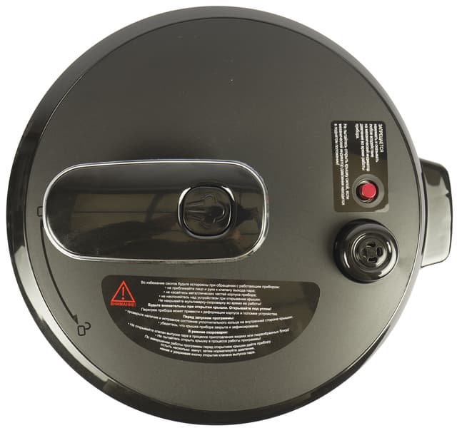 Сверху съемной крышки расположен паровой клапан, механический индикатор давления красного цвета и выступающая сверху ручка с кнопкой открытия парового клапана. Рядом с индикатором давления и около ручки наклейки с предупредительной надписью.