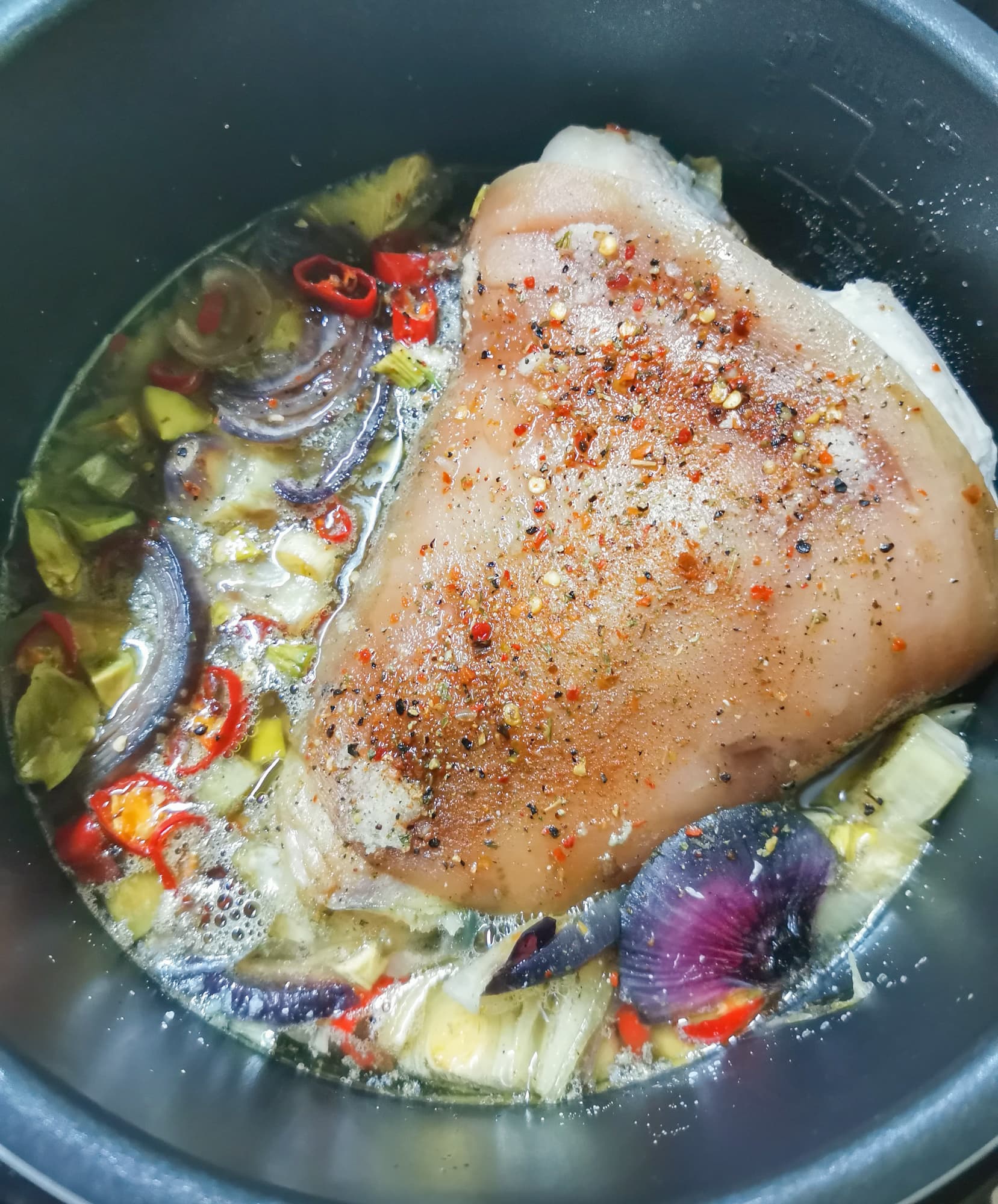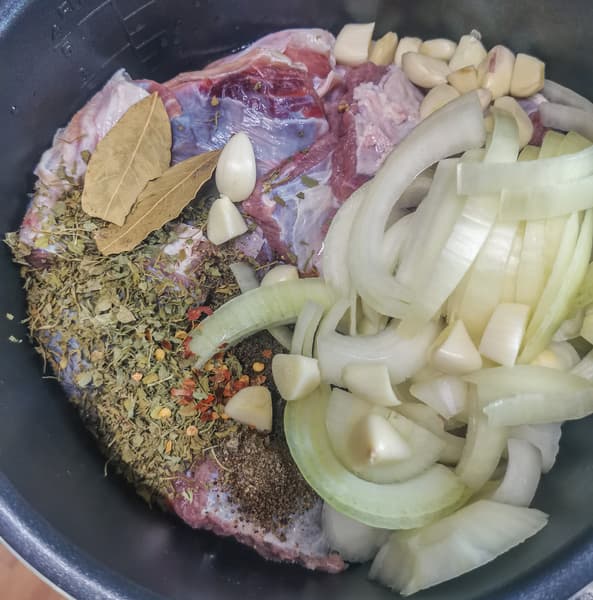 Помня про проблемы с рулькой, перемешали все ингредиенты, добавили немного воды и выставили режим томления на 6 часов.