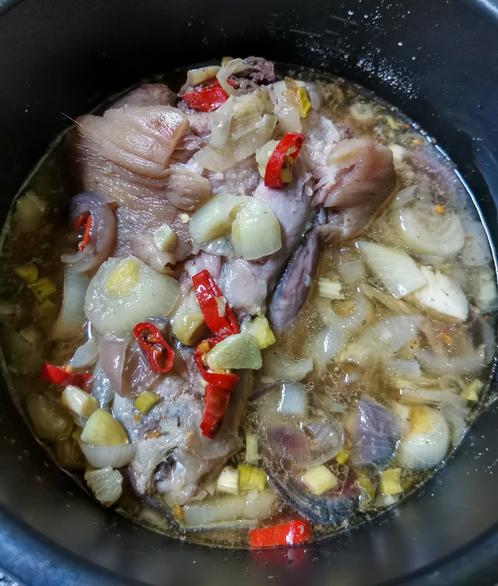 Сложили подготовленные продукты в чашу, выставили программу томления на 2 часа. После окончания проверили готовность. Овощи, конечно, приготовились, но мясо было совершенно жестким сверху, чуть лучше снизу, где находилось в соку. Но все равно рулька была еще совершенно не готова.
