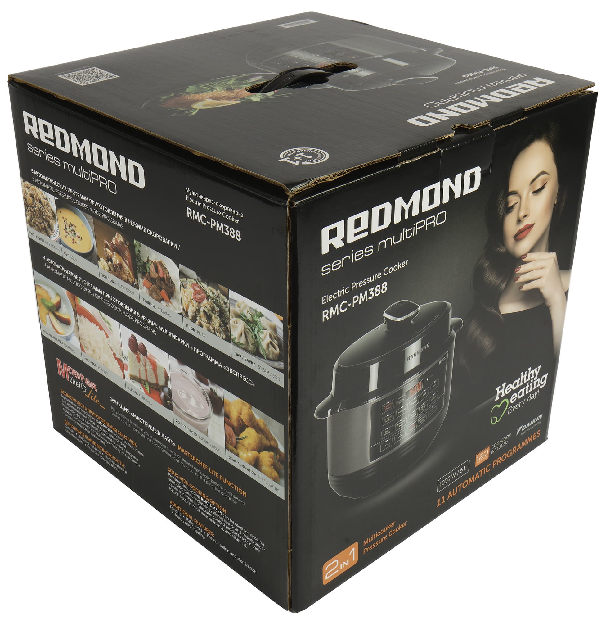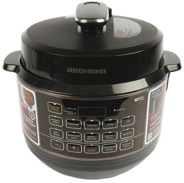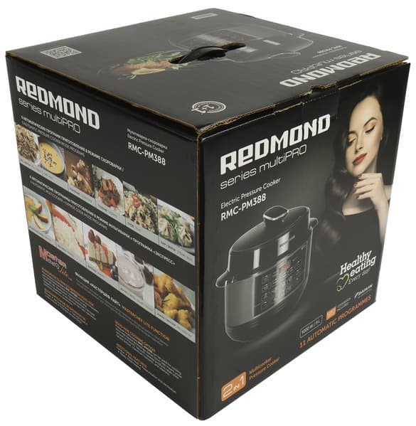 Мультиварку-скороварку Redmond RMC-PM388 доставили на тесты в красивой картонной коробке с пластиковой ручкой. Коробка оформлена в традиционном стиле производителя — в черных тонах с хорошими фотографиями прибора и технической информацией белым цветом.