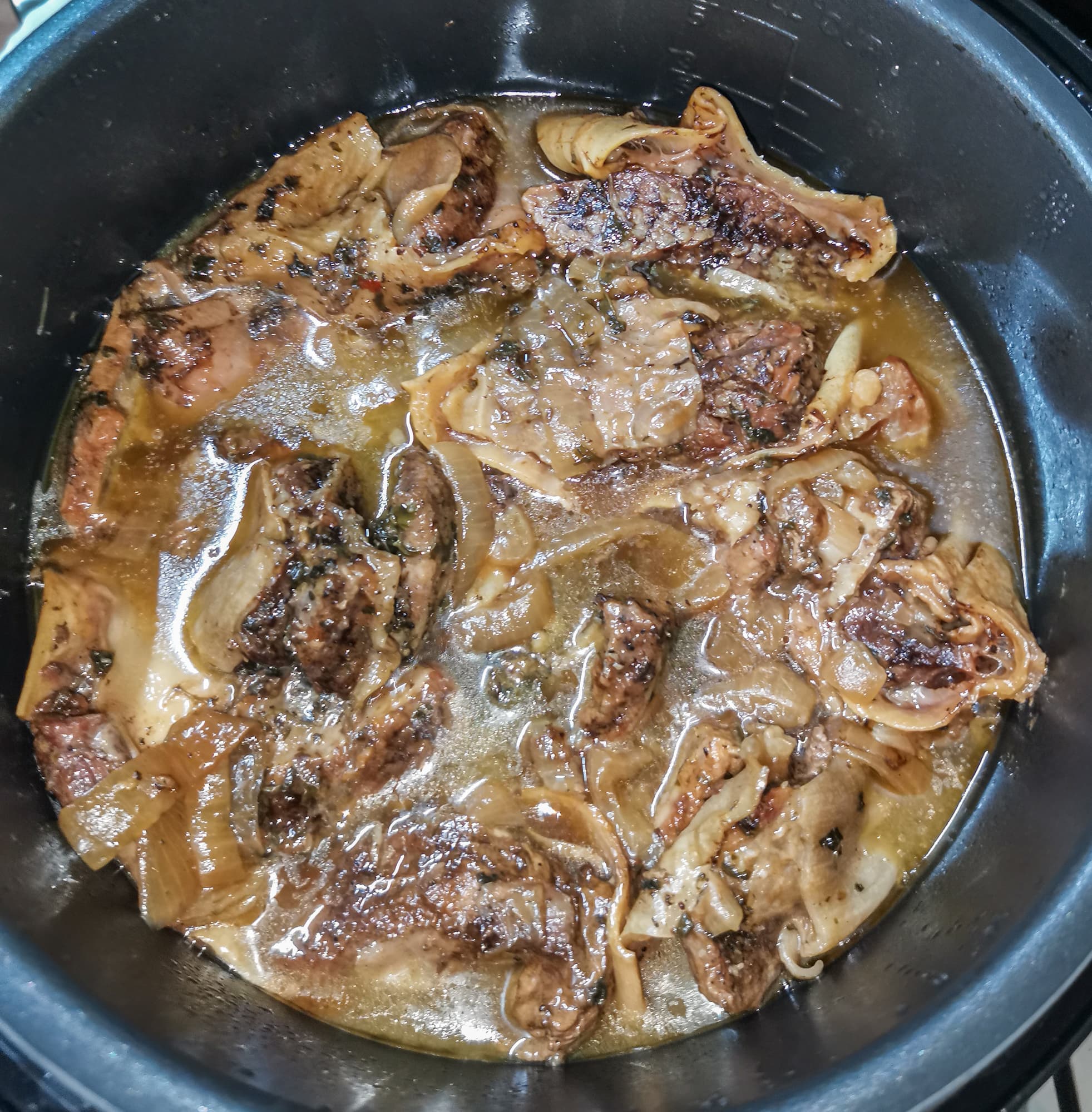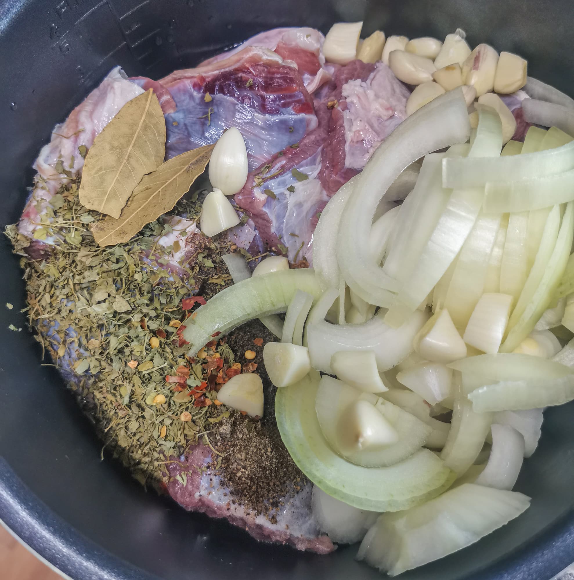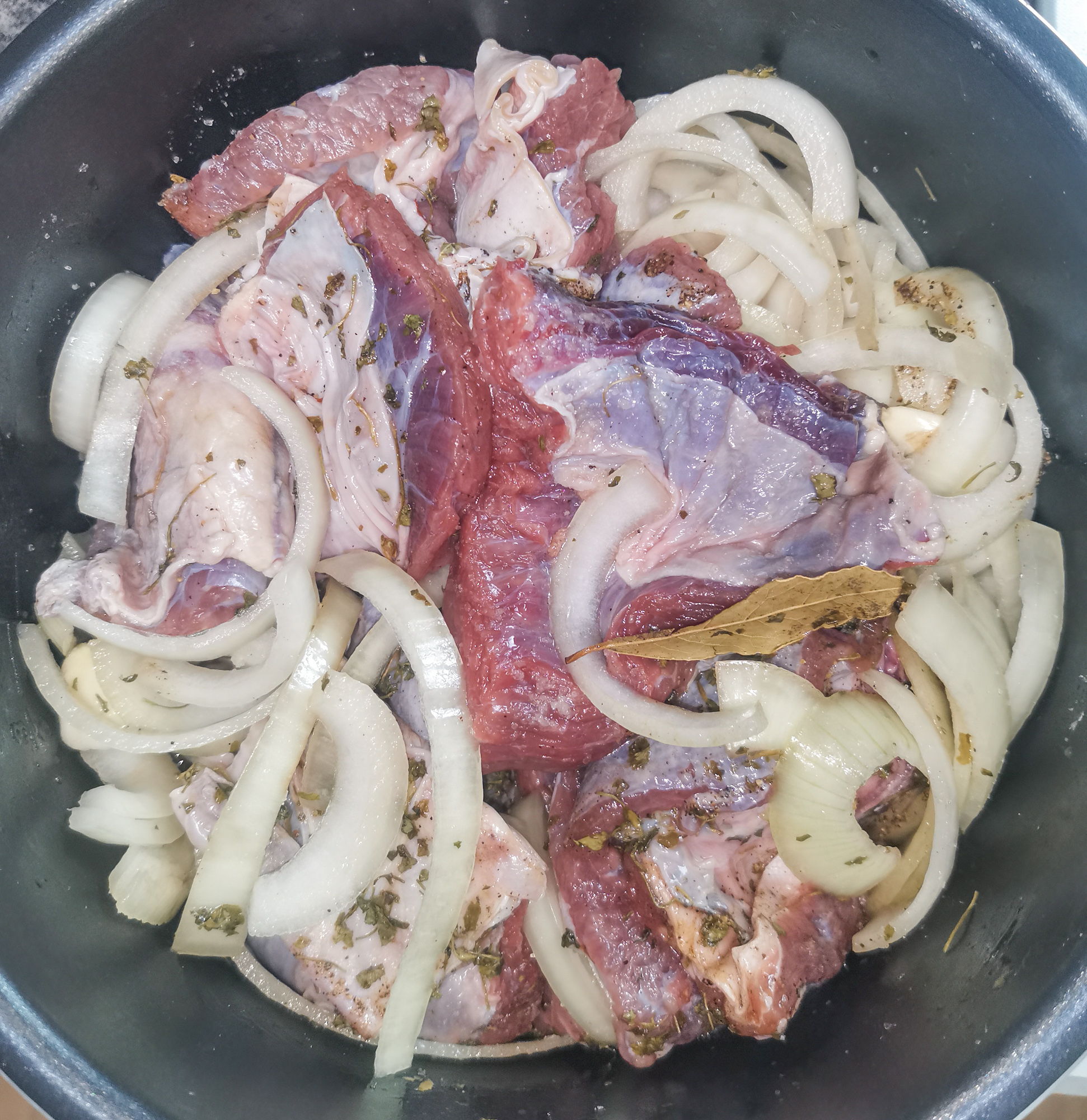 Накрыв мясо луком и перцем, мы не стали продолжать томить, а выставили программу «тушение» на 1,5 часа.