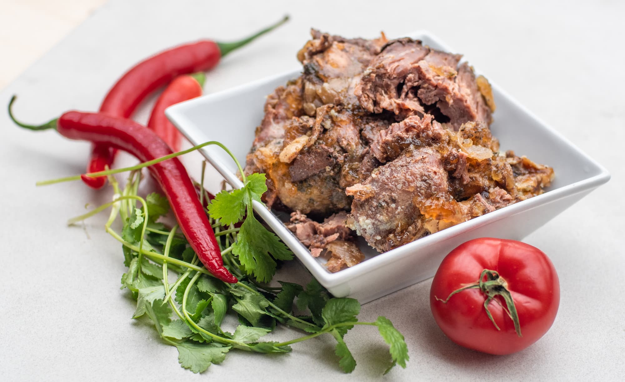 Для тушенки мы взяли крупно порезанную говяжью пашину, лук, чеснок, пажитник, специи, соль.
