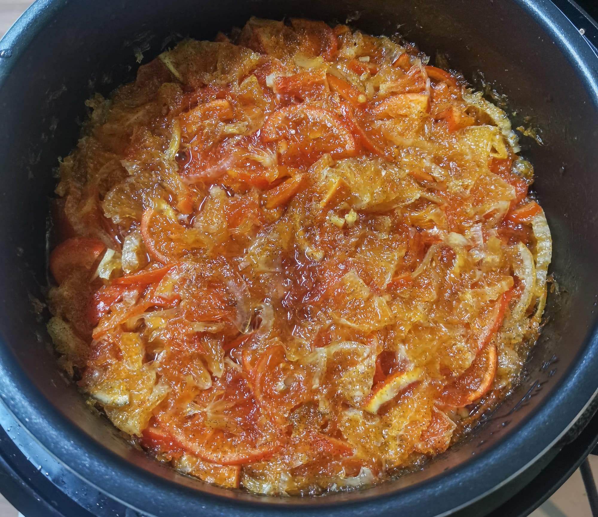 Выставили программу томления на 1 час. Через час слили половину получившейся жидкости, добавили сахара. Перемешали.