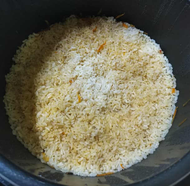 Хотя кажется, что верхний слой риса сухой, после перемешивания блюдо выровнялось и стало практически идеальной кондиции.