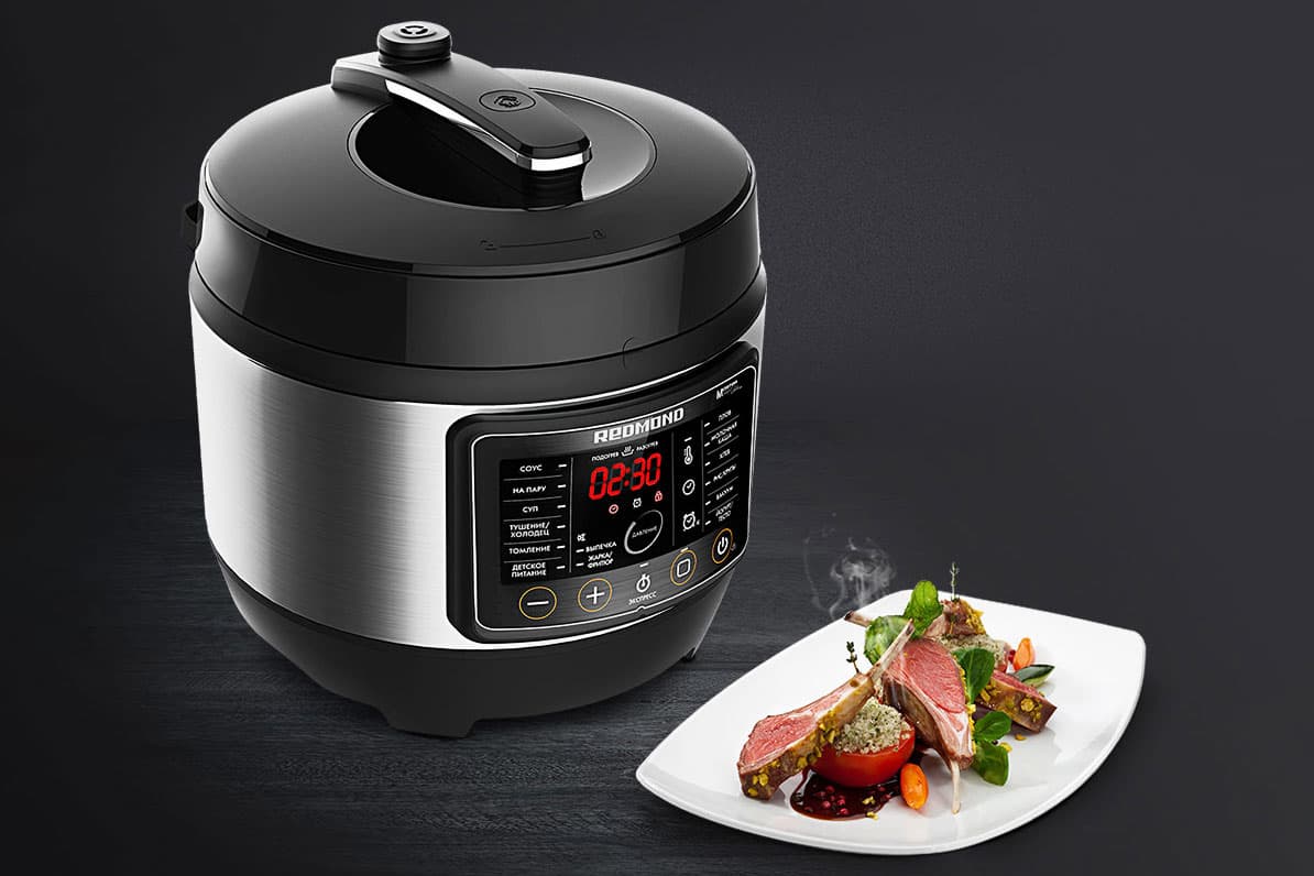 Redmond RMC-PM504 — устройство 2 в 1. Помимо стандартного набора режимов мультиварки у этой модели есть еще одно полезное умение — готовить под высоким давлением. Эта функция позволяет сократить время приготовления мяса, птицы и овощей в среднем в 1,5-2 раза, если сравнивать с обычной мультиваркой или с кастрюлей на плите.