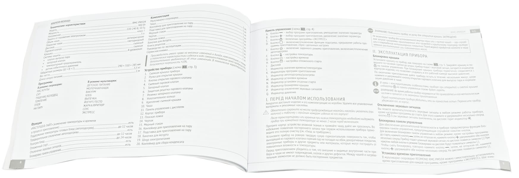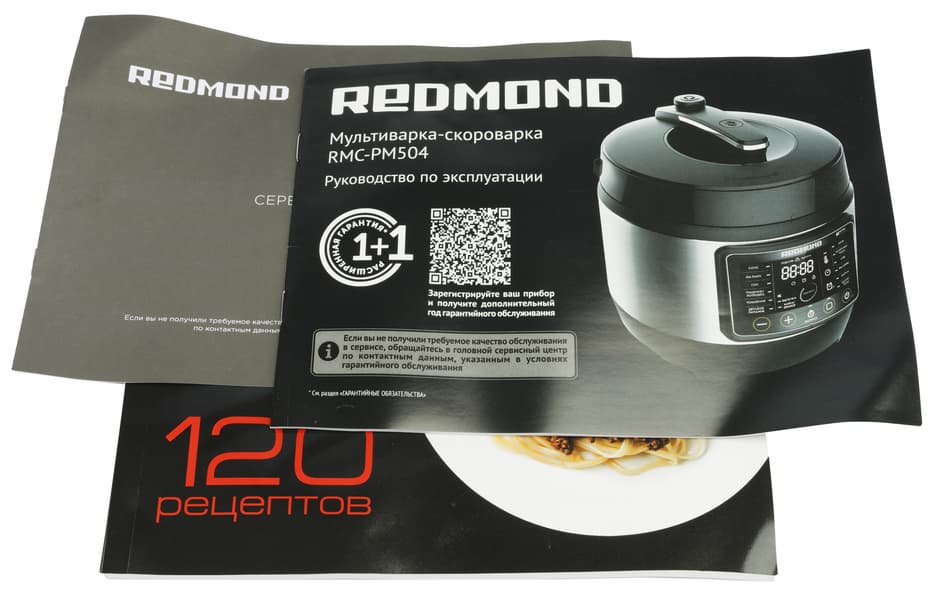 Печатные материалы для Redmond RMC-PM504 представлены руководством пользователя, сервисной книжкой и иллюстрированной книгой рецептов.