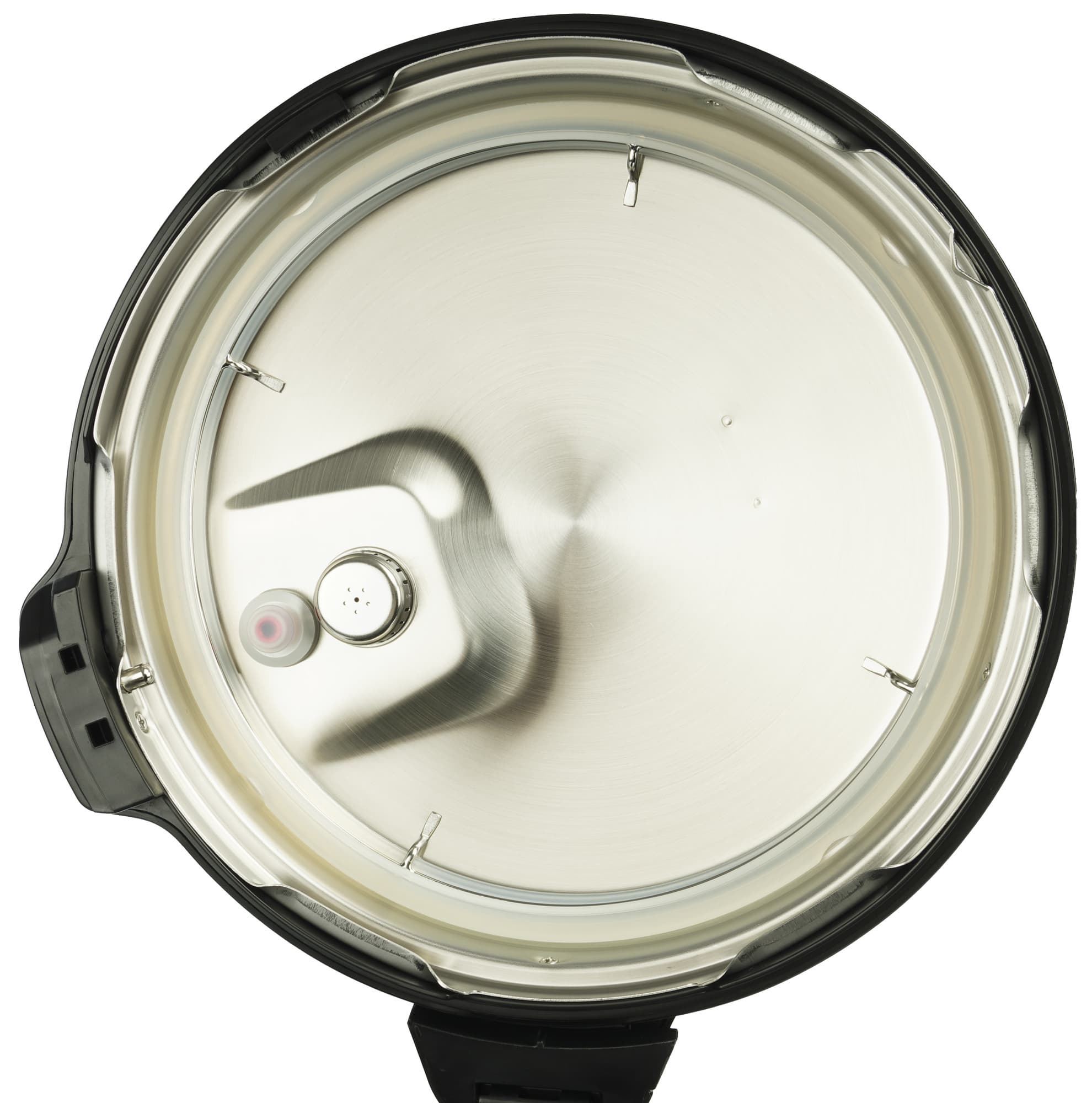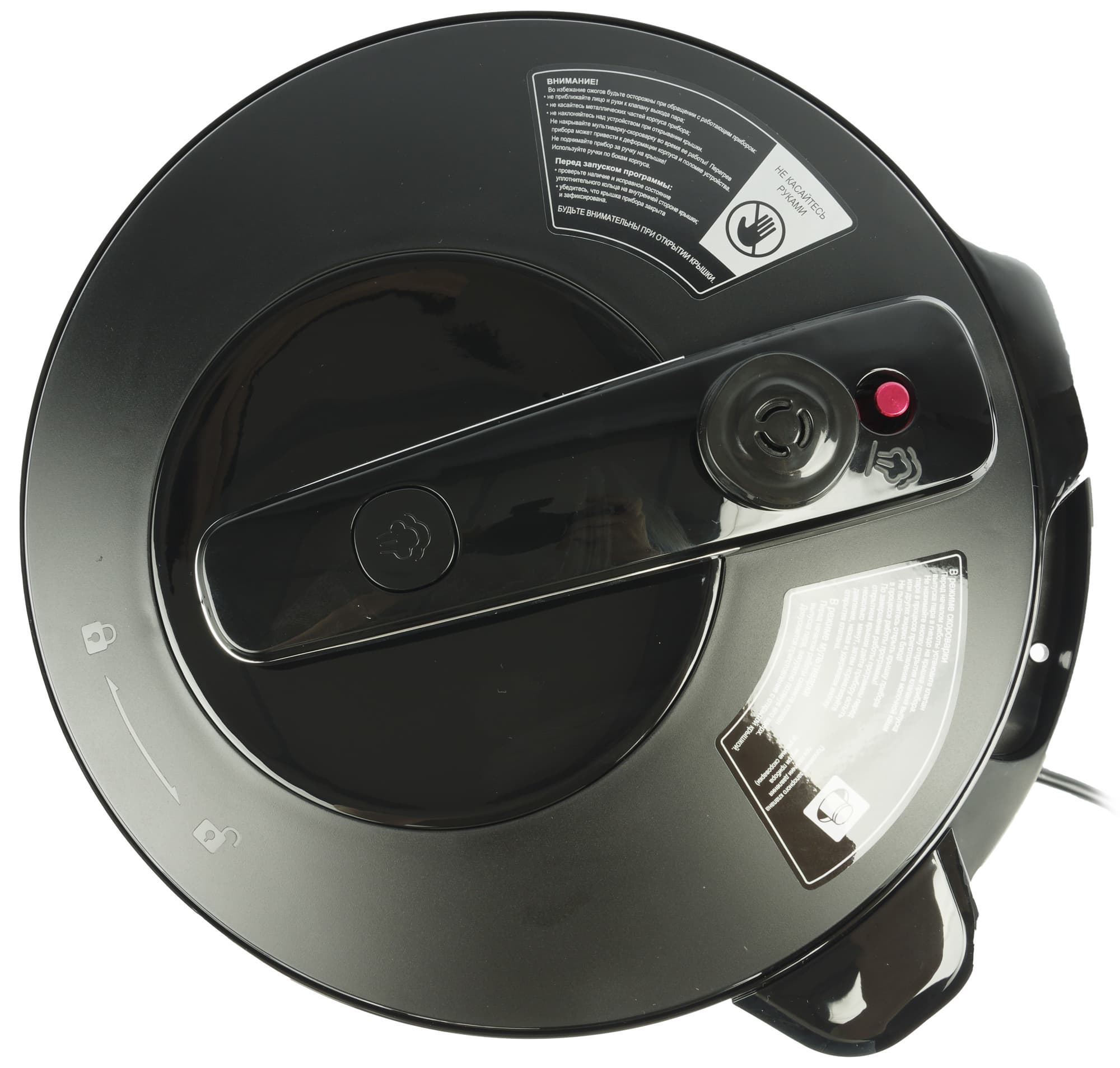 Сверху съемной крышки расположен паровой клапан, механический индикатор давления красного цвета и кнопка открытия парового клапана на ручке. Рядом с индикатором давления и около ручки размещены наклейки с предупредительной надписью.