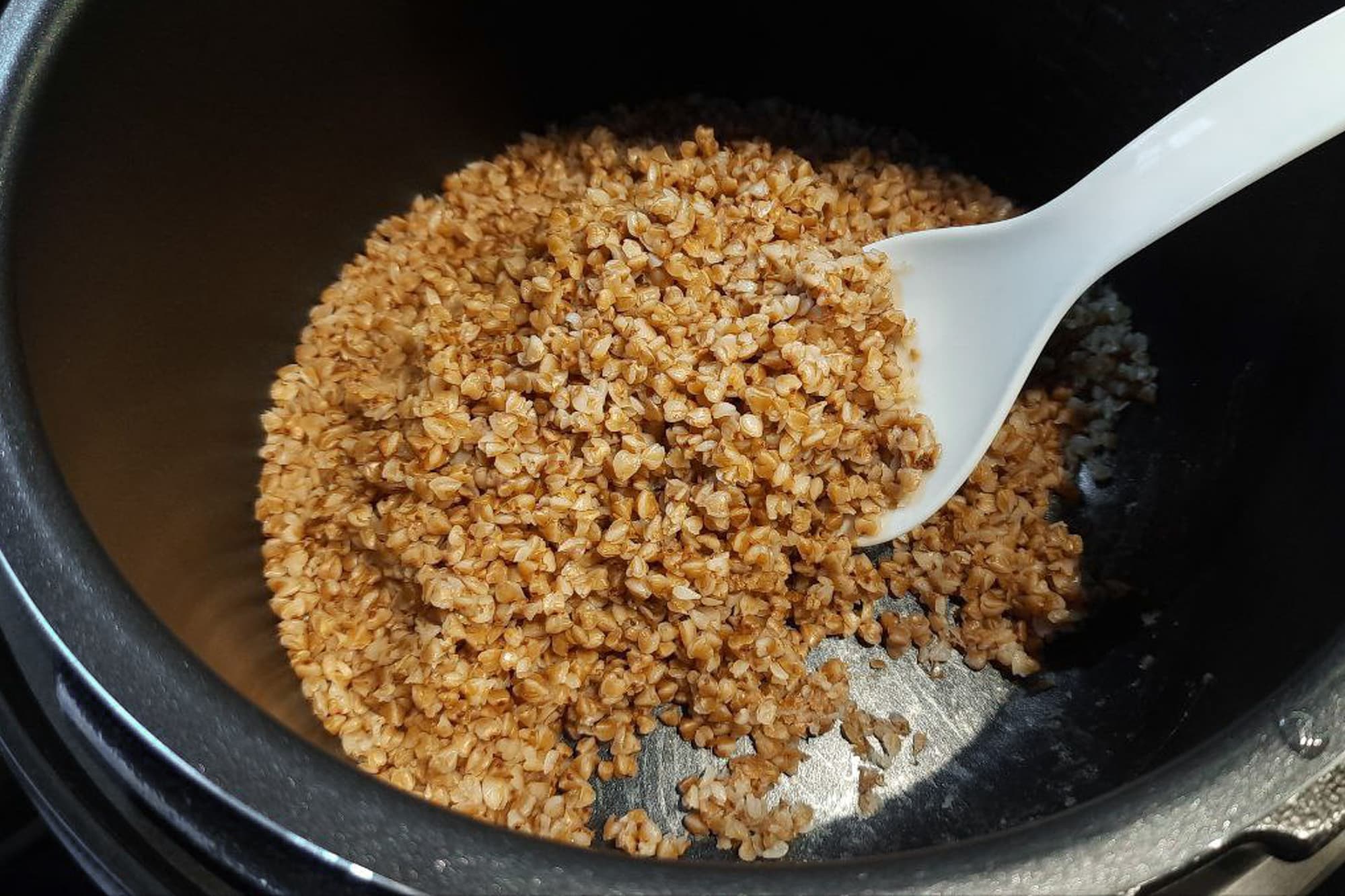 Вынули клапан из крышки. В чашу насыпали 200 г предварительно промытой гречневой крупы, налили 400 г холодной воды, закрыли крышку и запустили программу.