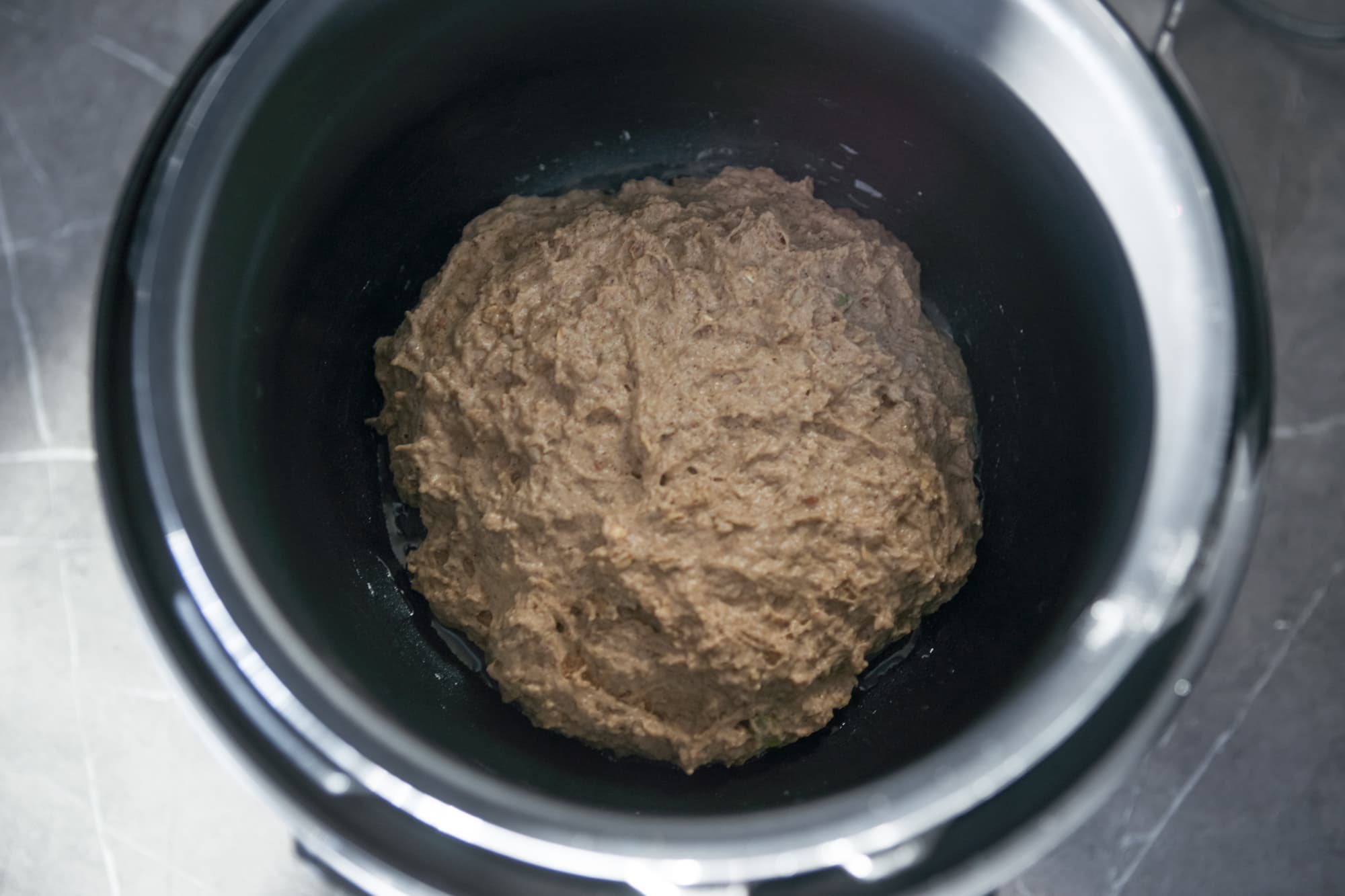 Чашу слегка смазали растительным маслом и выложили на дно на тот момент еще совсем неказистый с виду комок теста. Закрыли крышку и включили режим Йогурт/Тесто на 1 час.