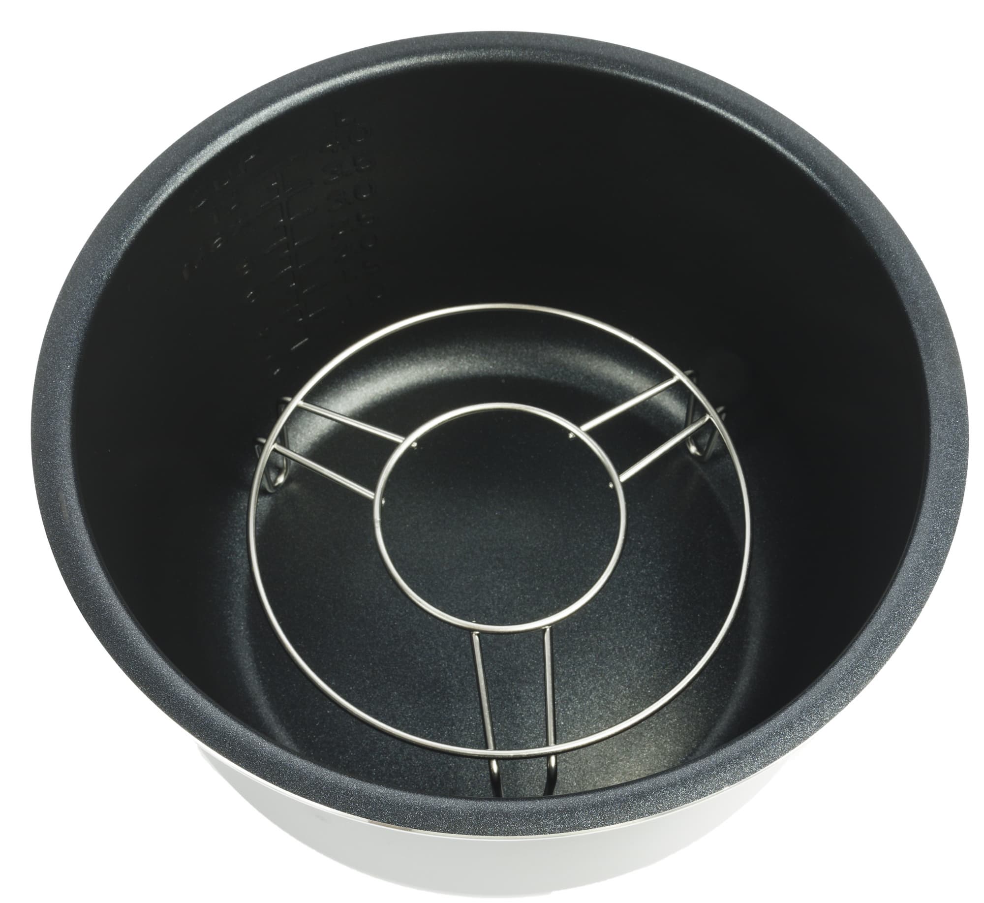 Крышку после приготовления следует разобрать: клапан и силиконовое кольцо можно просто промыть под краном, неразборные части крышки протереть влажной тряпкой или салфеткой. В инструкции ничего не говорится о мытье отдельных элементов мультиварки в посудомойке, но мы предполагаем, что пластиковым аксессуарам машинная мойка не повредит.