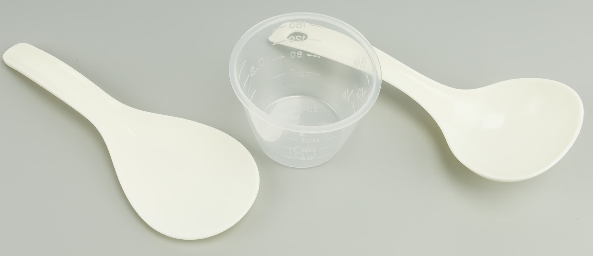 В комплект мультиварки входят также плоская ложка, черпак и небольшой мерный стакан объемом 160 мл.