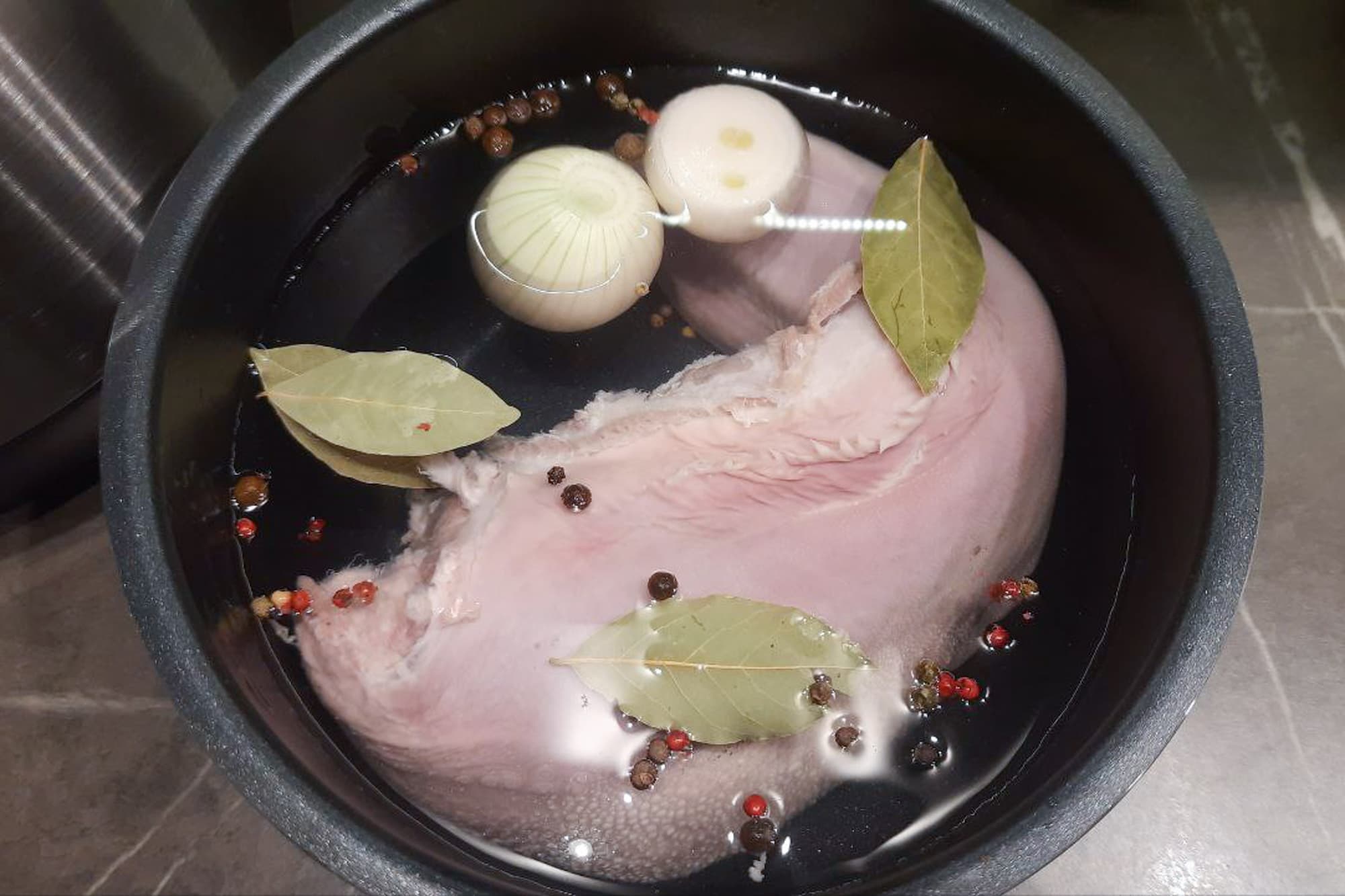 Установили чашу в камеру, закрыли крышку и выставили программу Тушение/Холодец. По рекомендациям из знакомых рецептов, учитывая вес языка, выделили ему 1 час.