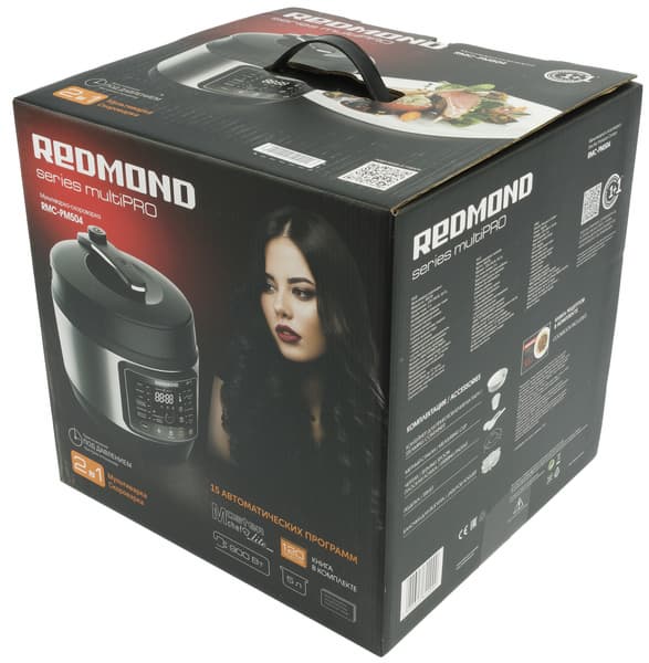 Упаковка мультиварки, как всегда у Redmond, красивая и с качественной полноцветной печатью. На гранях прочной картонной коробки размещены фотографии самого устройства, аппетитного блюда, приготовленного с его помощью и красотки для привлечения дополнительного внимания. По соседству с яркими изображениями находятся логотип компании, полное наименование модели, перечислены ее основные преимущества, комплектация, а также приведен список технических характеристик и данные о производителе.