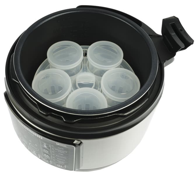 Для приготовления йогурта предусмотрены 5 пластиковых баночек с крышками. Они устанавливаются в ячейки пластиковой подставки на небольших ножках с резиновыми вставками. Чтобы конструкцию было удобно переносить, посередине есть ручка.