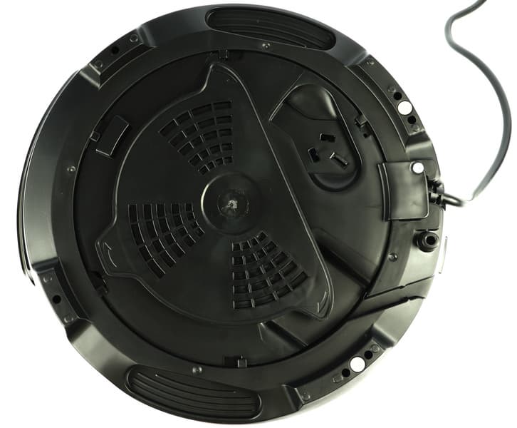 На дне мы видим четыре пластиковые ножки в виде прямоугольных выступов (две из них с резиновыми вставками) и одну круглую. По бокам в основании есть пара вырезов для удобства захвата корпуса руками при переноске. По центру размещены вентиляционные отверстия.