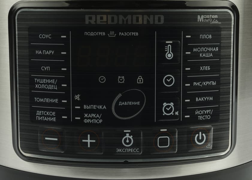 На панели управления Redmond RMC-PM504 восемь механических кнопок и масса индикаторов с подписями функций и автопрограмм. Дисплей отображает текущие параметры, такие как оставшееся время при выборе температуры и времени приготовления, а также уровень давления, если эта функция предусмотрена программой.