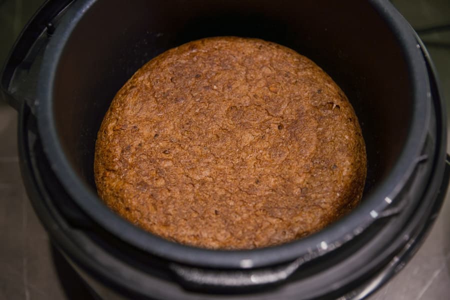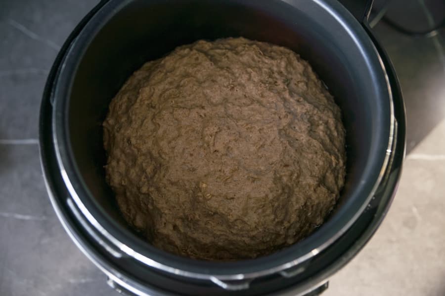 Мы его обмяли прямо в чаше, затем снова закрыли крышку и установили программу Хлеб. По умолчанию она длится 3 часа: в течение первого идет расстойка, а затем выпекание. За 20 минут до окончания мы открыли крышку и перевернули буханку.