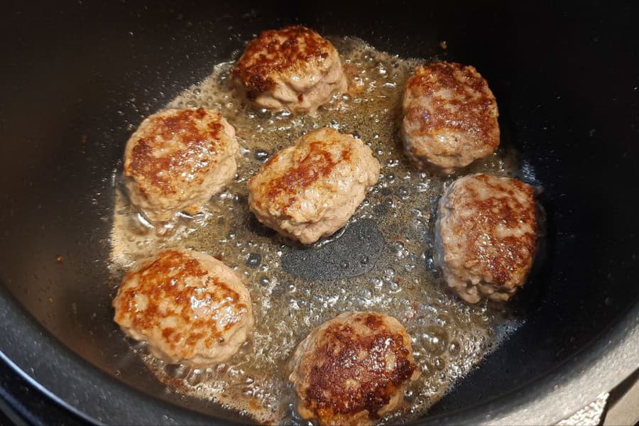 Здесь мы проверяли режим Жарка и равномерность нагрева дна. По умолчанию программа задает максимальные 180 градусов и выставляет 18 минут. Уже через 1,5 минуты мультиварка вышла на рабочую температуру и пошел обратный отсчет времени. Мы выложили котлеты на дно чаши и стали наблюдать. Обжаривание происходило с открытой крышкой.