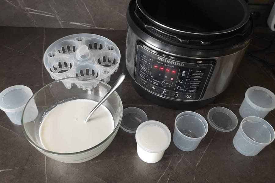 Redmond RMC-PM504, как мы помним, комплектуется симпатичными баночками для йогурта и имеет специальный режим для его приготовления, и мы решили не игнорировать этот факт. Взяли 550 мл молока жирностью 3,2% и 120 г густого йогурта без добавок жирностью 2%.
