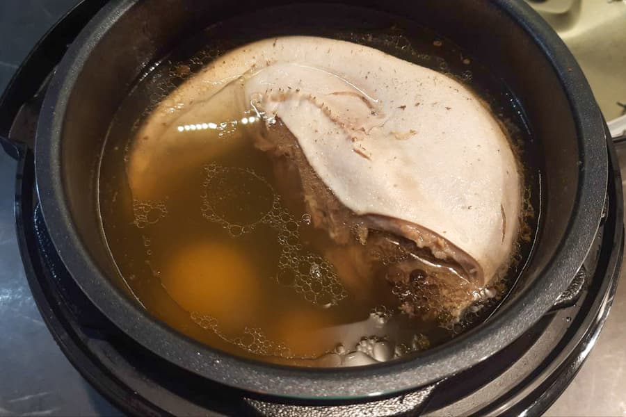 Примерно через 20 минут прибор набрал давление, пару раз спустил пар и включил обратный отсчет времени. Какой результат ждал нас в итоге? Насыщенный бульон и отлично сваренный язык.