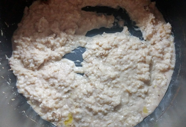 Перед тем, как отправиться спать, мы поместили в чашу мультиварки стакан риса, три стакана молока, стакан воды (в рецепте воды было два стакана, но нам показалось, что жидкости многовато), пару столовых ложек сахара, немного корицы, щепотку соли и небольшой кусок сливочного масла. Включив режим «Мультиповар», мы установили температуру в 95 градусов — именно ее рекомендует инструкция для молочных каш, а время приготовления ограничили указанными в рецепте 45 минутами. Таймер мы установили так, чтобы к 10 утра у нас была готова каша.