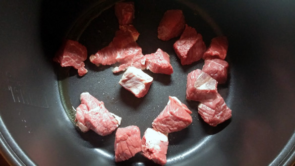 Сначала мы пять минут разогревали мультиварку, потом в течение 10 минут обжаривали на оливковом масле и при открытой крышке мясо. С обжариванием получилось не очень удачно. Мясо, начавшее было приобретать румяную корочку, вдруг принялось вариться в собственном соку — температура падала, потом снова поднималась, потом снова падала. Если для овощей это не принципиально, то мясу все-таки нужно жариться на равномерно-высокой температуре.