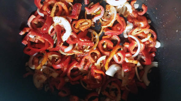Ладно. Мясо мы вынули и загрузили в чашу лук со сладким перцем. Какое-то время мы их обжаривали при открытой крышке, затем добавили специи (майоран, паприку и чили) и банку томатов в собственном соку. Потушили еще минут пять. Затем мы вновь отправили в мультиварку мясо, закрыли крышку и принялись ждать.