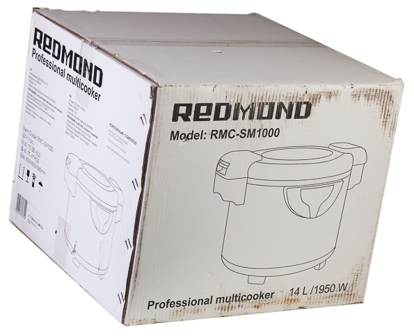 Профессиональная мультиварка Redmond RMC-SM1000 и упакована как профессиональный прибор: простая белая картонная коробка со схематичным изображением модели. Ничего лишнего. Ручки по бокам или сверху на коробке тоже отсутствуют, что представляет некоторую сложность при переноске: мультиварка действительно тяжелая.