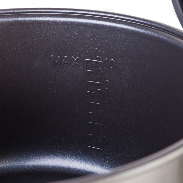 Чаша для готовки напоминает хороший казан, только не из чугуна, а из алюминия: легкая (доставать ее из мультиварки легко, даже несмотря на отсутствие ручки и вопреки тому, что внутри плещутся пять литров обжигающего супа), очень вместительная, с мерной шкалой внутри, она защищена японским антипригарным покрытием Daikin, что внушает уважение.