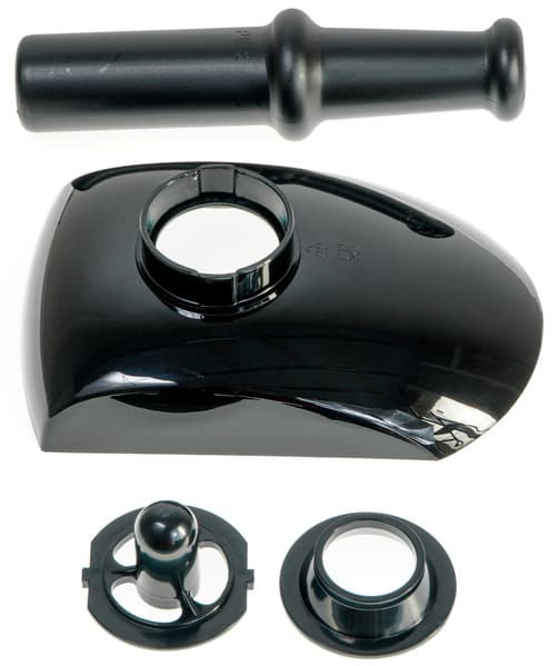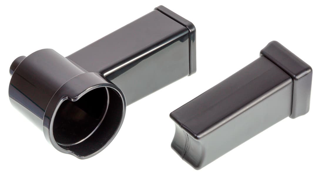 Толкатель, загрузочный лоток и насадки для изготовления кеббе и колбасок изготовлены из черного пластика. Лоток фиксируется на загрузочном отверстии мясорубки, что позволит ему не сдвигаться и не крутиться вокруг насадки во время работы. Толкатель оснащен длинным держателем, удобно лежит в руке, не напрягая ладонь или пальцы. Насадки для колбасок и кеббе состоят из двух деталей: основания и формующей насадки.