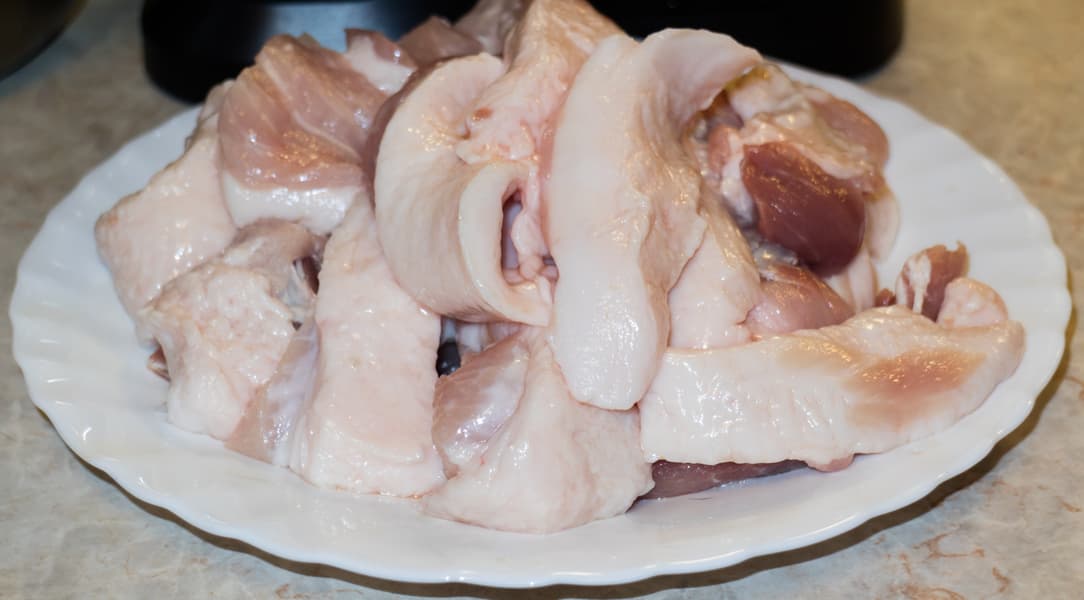Подготовили свинину — помыли и нарезали на куски подходящего размера.