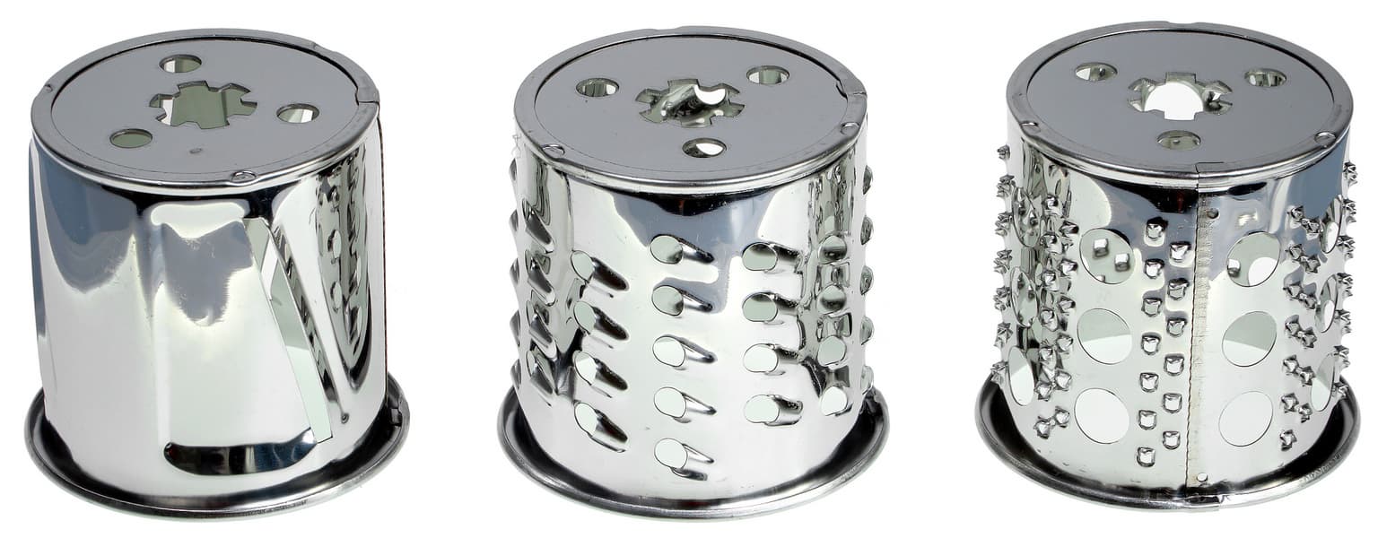 Насадка для нарезки овощей и других продуктов представляет собой отдельный корпус с толкателем и металлическим цилиндром, который, вращаясь, измельчает продукты.