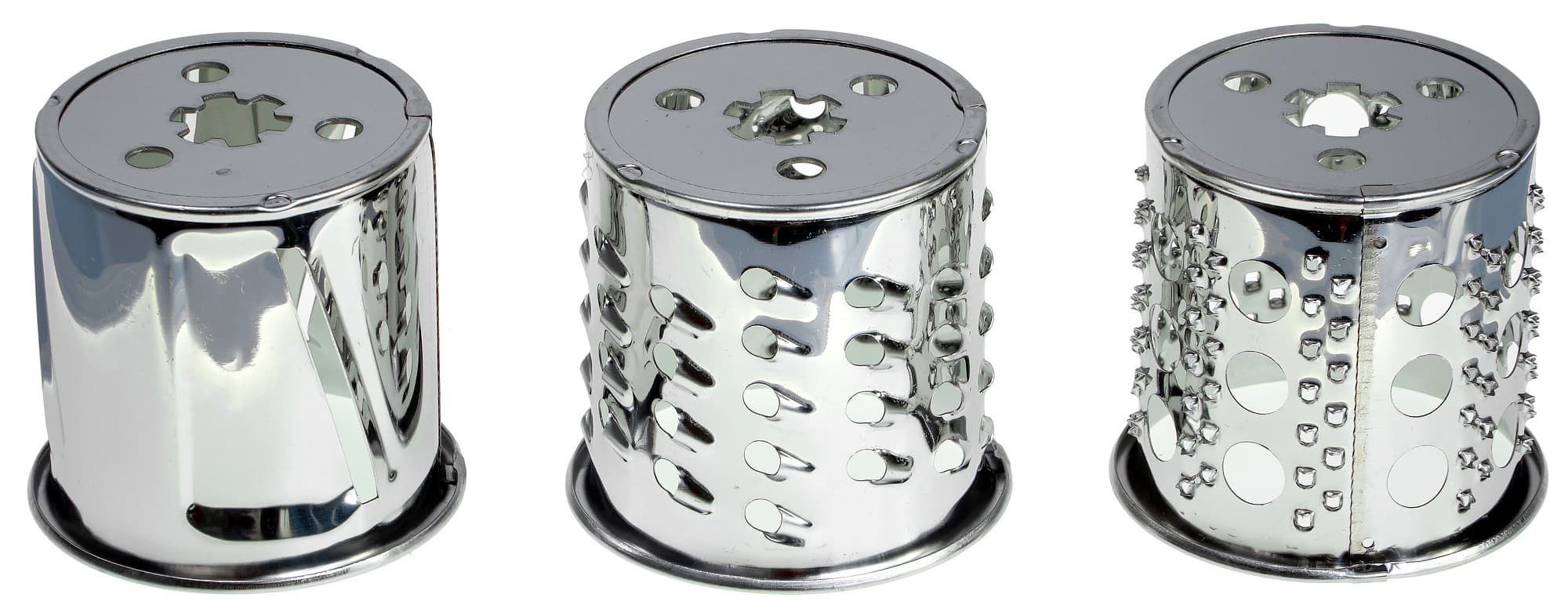 Мясорубка Redmond RMG-1239-6 укомплектована тремя цилиндрами для разной нарезки: две терки (мелкая и средняя) и шинковка-слайсер. Режущие кромки весьма острые. Для того чтобы зафиксировать деталь внутри корпуса, следует просто совместить отверстия на дне цилиндра с выступами на валу корпуса.