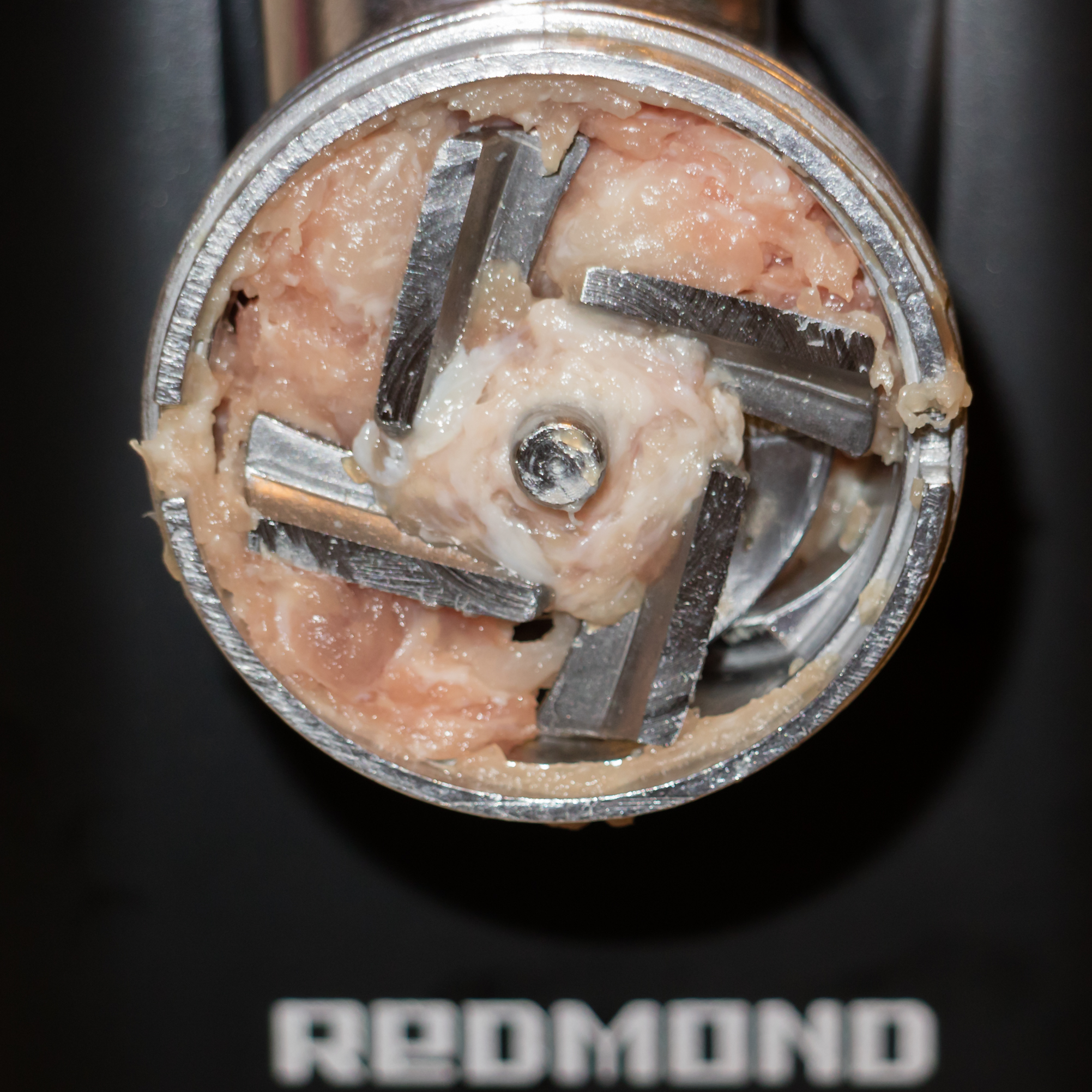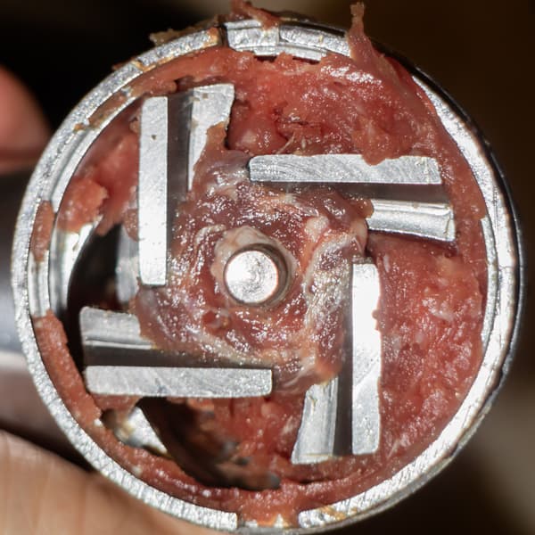 После разборки взвесили оставшееся внутри и на ноже мясо — его вес составил 23 г. На ножах и шнеке очень мало непрорезанных или накрутившихся жилок.