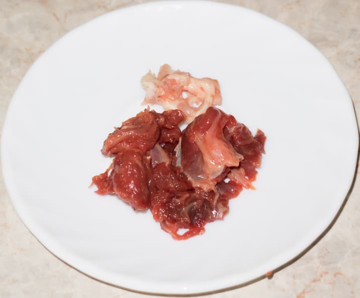 Теперь проверим способности мясорубки Redmond RMG-1239-6 в области переработки сложного мяса. Для этого теста мы взяли охлажденную говяжью голяшку с огромным количеством толстых и тонких жил. Однако даже после удаления наиболее крупных жил мясо не оставляло впечатление пригодного для превращения в фарш, по крайней мере, нашу домашнюю мясорубку мы такому испытанию подвергать не стали бы.