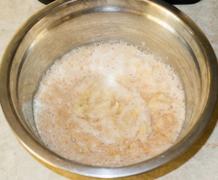 Процесс натирания занял около двух минут. Масса жидкая, однородная, с чрезвычайно мелкими кусочками картофеля.