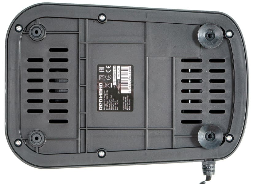 Со стороны дна можно видеть наклейку-шильдик с краткой технической информацией об изделии, вентиляционные отверстия и четыре ножки, две из которых снабжены 2,5 см в диаметре резиновыми присосками. Присоски хорошо справляются со своей функцией. Не знаем, как это будет происходить во время работы, но в покое прибор тяжело передвинуть или оторвать от поверхности стола — присоски надежно удерживают корпус на месте.