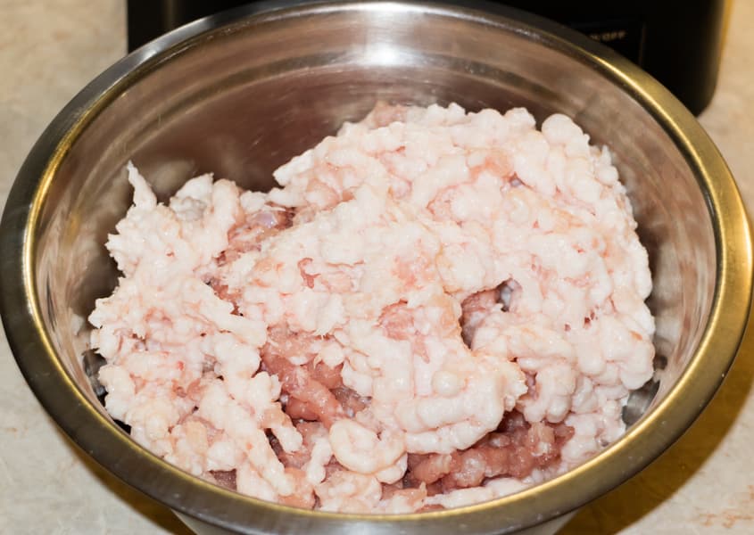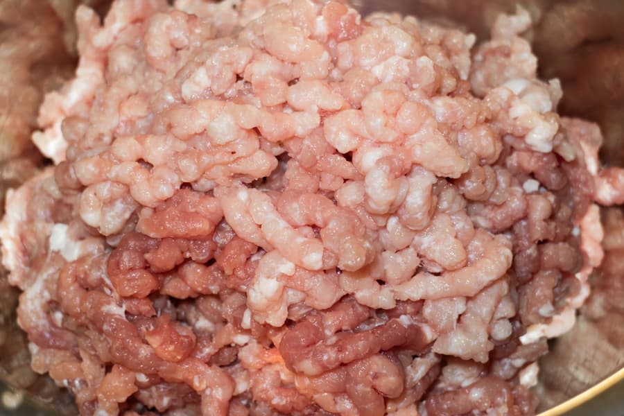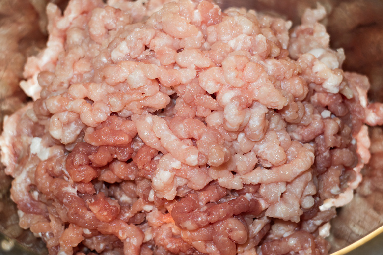 Затем пропустили через мясорубку обрезки с куска свинины.