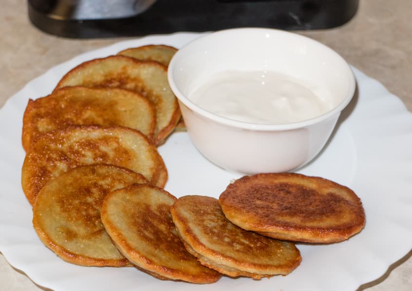 Драники получились с хрустящей корочкой и нежной мякотью. По субъективным ощущениям, по консистенции и плотности больше похожи на обычные бездрожжевые оладьи, но с ярким картофельным вкусом.