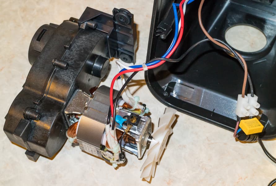 Теперь перейдем к результатам вскрытия. Мясорубка легко разбирается с помощью обычной крестовой отвертки. Какие-либо хитрые защелки отсутствуют. Механизм внутри установлен на четырех резиновых опорах и закреплен двумя саморезами.